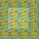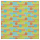 Esta tela tiene un diseño moderno de mediados de siglo de rectángulos repetidos en verde lima, marrón canela y turquesa con círculos sobre la parte superior.
