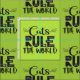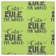 Un patrón de moda y adorable con las palabras "Los gatos dominan el mundo" en negro, decorado con whiskys blancos, arañazos de gatos, un ratón pequeño y un poco de pata, sobre un fondo verde brillante.