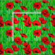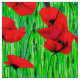 Tela en un patrón semiabstracto de acuarela de cachorros rojos en un campo, contra tallos y hojas verdes
