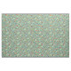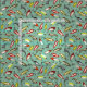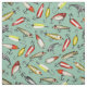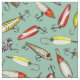 Esta tela tiene ilustraciones de señas de la pesca inspirados en los lures de la pesca vintage en tonos rojos y amarillos sobre un fondo verde azulado pálido.