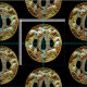 Impresión única de un medallón asiático dorado de Vision Studio. Un arcoiris de colores otoñales acaricia el ojo, dándole al medallón un ambiente cálido contra el fondo negro. ¡Recibe tu copia hoy!