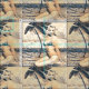 Modelo de Bikini Pinup Blonde Vintage arrodillado al borde de la arena mientras las olas la salpican, al personalizar