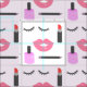 Un diseño lindo del maquillaje, ofreciendo el lápiz labial rojo, labios, un lápiz púrpura del eyeliner, las pestañas falsas, y esmalte de uñas del rosa.