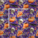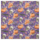 Un encantador patrón de acuarela de Halloween pintado a mano con calabazas, cráneos, murciélagos y flores de otoño sobre un fondo morado. Los audaces tonos violetas le dan un ambiente vintage y acogedor, perfecto para tejidos de temporada, edredones y decoración festiva.