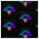 Luciérnagas mecánicas antiguas con bombilla de luz y finas alas brillan naranja, violeta, turquesa sobre fondo negro. Estilo Steampunk.