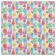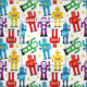 Tejidos con motivos de niños coloridos cubiertos de robots de juguete retro rojos, azules, púrpura, amarillos y verdes y extraterrestres sobre blanco