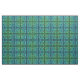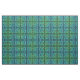 Un trozo de tela con un nudo celta azul-verde repetido diseño de mosaico cuadrado contra un fondo negro.