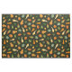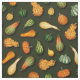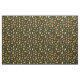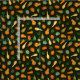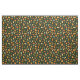 Esta tela tiene pequeñas calabazas en tonos verdes, amarillos y naranjas sobre un fondo verde oscuro.