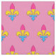 Tela con un patrón impecable con fleur-de-lis en los colores de la bandera del orgullo pansexuality, sobre un fondo rosado; suministros de manufactura de orgullo bi