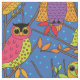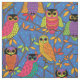 Estos sabios búhos, con sus grandes ojos y su plumaje rosa, naranja, púrpura y verde, se sientan en un árbol con coloridas hojas de otoño sobre un fondo azulado. Ideal para los amantes de los búhos o para la temporada de Halloween. Arte original © Anne Coffey.