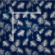 Tejidos de impresión tropical con un patrón de hojas blancas de palma sobre un fondo azul de medianoche.