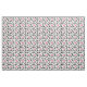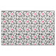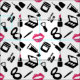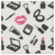Tela con un patrón de maquillaje en rosa, negro y blanco con productos cosméticos como lápiz de labios, rímel, sombrilla y más.