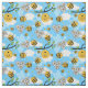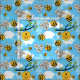 Tela super linda con abejorros sonrientes felices, colmenas, panales de miel y flores sobre un cielo azul de verano