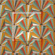 Un ventilador retro en tonos verdes, naranja quemado, dorado y marrón.