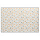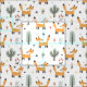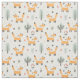 Un feliz zorro dorado es la característica de esta tela linda. Junto con las imágenes del zorro hay árboles y flores forestales. Todo está situado sobre un fondo blanco.