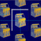Ilustracion de rockola retro azul y naranja. Patrón sin foco. Color de fondo personalizado.
