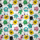Las imágenes monstruosas personalizados amigables para niños hacen un patrón colorido y divertido en esta tela. Las imágenes incluyen monstruos morados, monstruos negros con muchas piernas, un montaje amarillo con un gran ojo rosa, monstruos verdes y azules. ... Los colores son amarillo, rosa, negro, verde, verde azulado sobre fondo punteado.