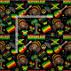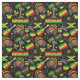 A los aficionados a la música reggae les encantará esta colorida tela temática de reggae. Presenta hombres rastas, instrumentos musicales y banderas jamaiquinas y rastafari