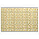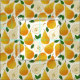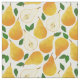 Patrón de peras doradas vibrantes en tonos amarillos y naranjas con hojas verdes brillantes. Algunas de las peras se han reducido a la mitad para mostrar los jugosos interiores y semillas.