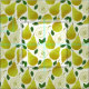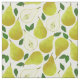 Patrón de peras verdes vibrantes en tonos amarillos y verdes con hojas verdes brillantes. Algunas de las peras se han reducido a la mitad para mostrar los jugosos interiores y semillas.