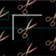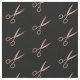 La tela con motivos decorativos de corte estilizado presenta un patrón de tijeras falsas de Relieve metalizado dorado sobre un fondo negro. Perfecto para peluquerías, estilistas, coloristas o peluquerías.