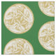 Trío intrincado de perros celtas dorados y blancos en un patrón en forma de disco sobre fondo verde