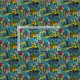 Un trazo floral tropical brillante en tonos azules, verdes, dorados y rosas.