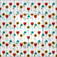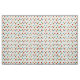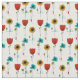 Esta tela de bonito tiene un patrón general de diseño floral inspirado en Art Nouveau en rojo, amarillo, azul turquesa, verde claro y negro con acentos geométricos simples contra un fondo blanco.
