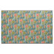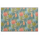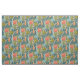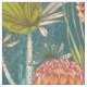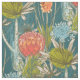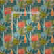 Un patrón botánico africano abstracto en tonos naranjas, burdeos, azules y verdes sobre un fondo azul verde azulado.
