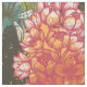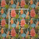 Un patrón botánico africano abstracto en tonos naranjas, rojos, azules y verdes sobre un fondo oscuro.