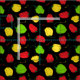 Tela negra con estampado de chiles fieros rojos, verdes y amarillos de escotilla, muy conocidos por ser usados en populares platos caribeños