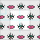 Tela blanca con un patrón kitsch sin fisuras de labios rosados brillante y ojos azules con sombra ocular amarilla y pestañas largas.