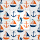Patrón marino sin foco, con botes, anclas y caballos de mar de colores azul oscuro y naranja.