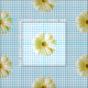 Este bonito diseño tiene un patrón retro de margaritas en un fondo azul de gingham.