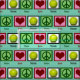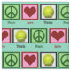 Tela de tenis verde azulada cubierta de carteles de paz, corazones y pelotas de tenis.