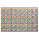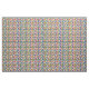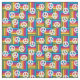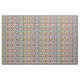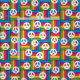 Esta tela tiene un diseño de cuadrados hechos de rectángulos en colores vivos de los años 70 con signos de paz dispersos alrededor.