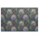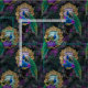 Este bonito diseño exhibe un pavo real azul con plumas verde azuladas sobre un marco dorado con flores moradas.
