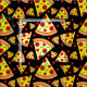 Tela colorida y divertida con estampado de lonas de pizza de pepperoni sobre fondo negro