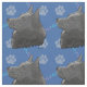 Una representación artística de la cabeza de un perro de Schipperke sobre un fondo azul con huellas de pata en gris, rosa y azul.