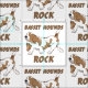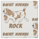 Un lindo ilustracion de estilo personalizado de un peregrino caminando. El perro marrón y blanco tiene el texto, BASSET HOUNDS ROCK. Un diseño para los amantes del perro.