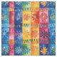 La imagen presenta un patrón repitiéndose sin fisuras con una estética vibrante y texturada, que recuerda a los tejidos de mano o a los cuadros acuarelas. Cuenta con una disposición tipo rejilla de bloques rectangulares, cada uno con motivos florales estilizados en una rica paleta multicolor. Los colores son azul, verde, amarillo, naranja, rojo y rosa. Los bloques tienen una superficie texturada, ligeramente desigual, lo que sugiere un efecto acuarela o artesanal. Los motivos florales son sencillos y repetitivos, lo que añade al arte folclórico o al ambiente artesanal. Este patrón es adecuado para diversas aplicaciones, como textiles, papel pintado y antecedentes digitales, especialmente aquellos que buscan un aspecto colorido, texturizado o artesanal.