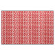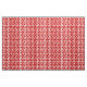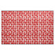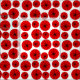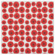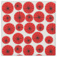 Esta tela tiene un diseño moderno de mediados de siglo de pinzas rojas hechas con círculos rojos y "radios" negros sobre un fondo blanco.