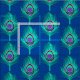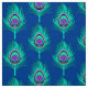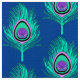 Tela en una impresión de la materia textil de la pluma del pavo real, ejecutada en el ilustrador de Adobe un Photoshop - la aguamarina ligera empluma, con un ojo en sombras de la púrpura violeta con aguamarina y negro, en un fondo profundo del azul de cobalto