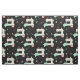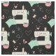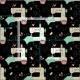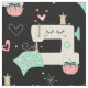 Mi ilustracion vectorial original de máquinas de coser alegres, pines, cojines de alfiler, estribos, cuadrados de tejido, corazones y hilos, en bronceado, rosa, agua, gris y blanco sobre negro.