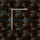 Giro atómico, edad espacial de los años 50, patrón retro moderno de mediados de siglo. Negro con remolinos de color morado, azul y amarillo.