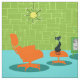Se dice que los perros tienen dueños y los gatos tienen el personal. ¡El felino en esta tela retra del gatito de la era espacial no podía estar de acuerdo más! El estilo de los años 60, características del diseño minimalistas del arte un gato liso, negro en una sala de estar moderna de los mediados de siglo. El cuarto sofisticado ofrece prominente un verde, pared de piedra. La alfombra es aguamarina con las sombras verde azuladas. El mobiliario del cuarto incluye un amarillo, una figura ligera de Sputnik, un sillón anaranjado con el escabel a juego y una televisión verde con los oídos de conejo. El gato negro afortunado puede ser visto se encaramó en el escabel delante de la televisión. ¡Su demostración preferida está prendido! En la pantalla de la televisión, podemos ver una familia blanco y negro, clásica de la televisión que soluciona todos los problemas de la vida en una demostración de media hora. Este diseño es purrrfect, si decimos tan nosotros mismos.