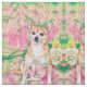 Cute Chihuahua arte tela colorida para ella. Fondo verde rosado y retrato de perra beige. Material de coser artesanal de la raza de alfileres. Hermoso, elegante, moderno, fresco, de moda, de diseño reflejado. Derechos de imagen de Marg Seregelyi Photography.