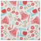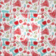 Patrón de temática vintage con delantales, mezcladores, utensilios de cocina y flores en tonos rosa, rojo y azul. Perfecto para proyectos de cocina chic y chic.