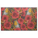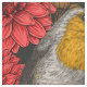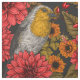Tela Robins en el jardín de otoño, dahlias rojas en neg