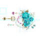 Llave de oro antiguo con rosas turquesa de moda decorados con hojas de oro blanco y cuentas rosas y azules. Color de moda. Rosas turquesas. Oro blanco. Tifanía azul.